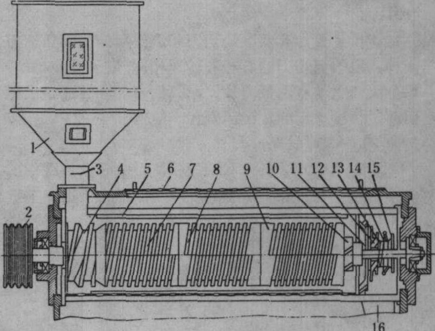 图2 螺旋米机结构示意图 1. 进料斗; 2. 三角胶带轮; 3. 进料插门; 4. 螺旋推进器; 5. 米刀; 6. 米筛; 7. 头段螺旋砂辊;8. 中段螺旋砂辊; 9. 尾段螺旋砂辊; 10. 拨米刮板;11. 出料口; 12. 弹簧压力门; 13. 弹簧; 14. 调压手轮; 15. 紧固螺母; 16. 出米口 |