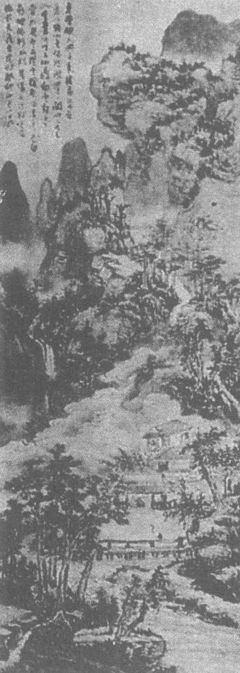 | 释义 | 髡残苍山结茅图轴清。髡残(见《髡残苍翠凌天图轴》条目)绘。纸本设色。纵89.8厘米,横35厘米。上海博物馆藏。这是一幅寄寓着作者理想境界、美妙生活的作品。图中山高水长,丛树幽深,弯弯山径向上延伸,一座古刹悬于山腰,浓厚的云雾缭绕在山野间,增加了些许仙气。潆回浸溢的山溪旁,一仙鹤正从松树中悠闲踱步,不远处有几间依山而筑的茅屋。其中两间房内各有一高士,一位在敞开的窗旁眺望美景,另一位在打坐参禅。画面构图充实严谨,以中锋勾勒云气和流水,笔墨洒脱浑厚,具有雄壮苍莽之势。作者于图右上角题诗一首:“卓荦伊人兴无数,结茅当在苍山路,山色依然襟带间,山客已入云囊住。天台仙鼎白云封,仙骨如君定可以。寒猿夜啸清溪曲,白鹤时依槛外柱。”