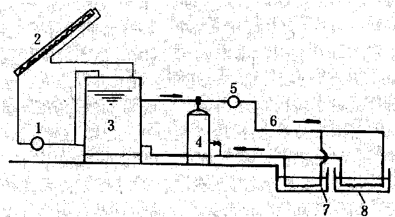 1.集热泵;2.集热板;3.蓄热槽;4.辅助锅炉;5.循环泵;6.通向鱼池热水管;7.池水中热水盘管;8.养鱼池