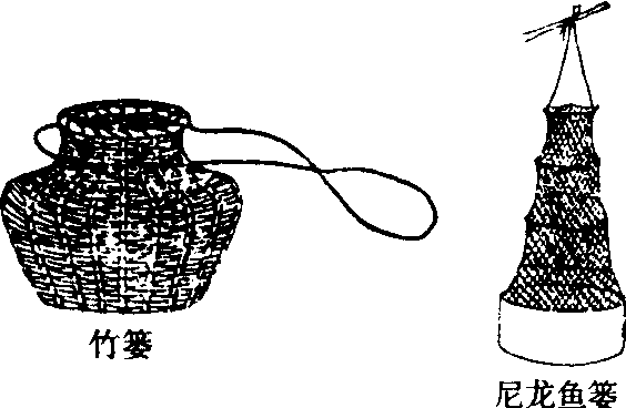 | 释义 | 鱼篓垂钓时使用的一种暂时盛放活鱼的盛鱼器。多用竹篾、藤条、柳条编织而成。鱼篓可终年适用,盛鱼容易成活。但体积较大,占地面积多,也不便携带,篓底易烂,用后要冲刷放置风干处保存。也可用尼龙线或锦纶线编织成的盛鱼小眼网袋加以改装成鱼篓。网袋虽体积小、可以折叠、携带方便,但空间小,鱼没有活动余地,彼此压挤容易死亡。如用粗铁丝制成3~4个直径与网袋内径相等的圈,可分段均分将其固定在长70厘米,直径30厘米的网袋上。网袋上端收口处用粗尼龙线绳穿过,轻拉线绳便能收紧网袋口,作为鱼篓使用,较为方便适用。