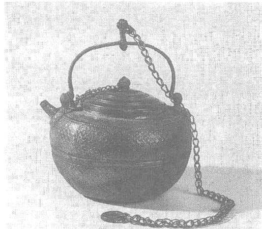 | 释义 | 鳞纹银壶辽。通高10.7厘米,口径7.6厘米。1954年内蒙古赤峰辽驸马墓出土。北京中国历史博物馆藏。此壶扁圆形,直口,阔肩,圆腹,平底,短流,弧形提梁上系一长链,另一短链与盖顶和提梁相连。腹部中间凸起一道带纹,通体作细鳞纹。此墓出土了大量金银器。此壶锤揲精巧,纹饰精细,是辽代银器中的优异之作。