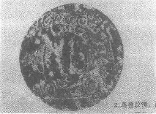 西周。直径6.7厘米,厚0.35厘米,钮长2.1厘米,钮宽0.45厘米,钮高0.25厘米。1957年河南省三门峡上村岭虢国墓地1612号墓出土。圆形,体较薄,镜面平直光泽,背面中部有两平行弓形钮,周围单线勾出简单、古朴的鹿、鸟、虎纹,其态生动。无镜铭。