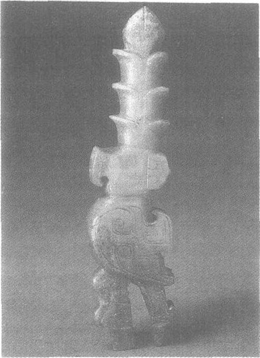 商。高13厘米,最宽3.2厘米,厚1.5厘米。北京故宫博物院藏。此器立雕而成,青色玉料上有黑斑并有浸蚀痕迹。鸟为站立状。尖喙内勾,耳呈扇形,短尾,振翅,足粗壮。以双钩阴线饰眼、喙、耳、羽毛和爪等部位。鸟头顶一塔状冠,造型颇为奇特。鸟足下有榫,可插嵌作柄用。