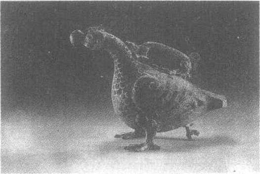 | 释义 | 鸟形铜尊春秋。古代盛酒器。高25.3厘米,长33厘米。山西省太原金胜村251号春秋墓出土。山西省考古研究所藏。此铜尊制成一引颈昂首挺立的鸟形。尖喙可张合,双目圆睁,冠上有花纹,背部开一椭圆口,上有盖,腹腔内空。通身饰形状不同的羽纹,腿部和翅下饰鳞纹。鸟背安一虎形提手。虎弓背匍匐,头部紧贴鸟颈,尾上卷,身饰勾形纹和鳞纹。虎后肢处引出一链与鸟身相连,鸟身下部靠尾处有一虎形支脚。整件器物造型朴实浑厚,写实性与装饰性结合,纹饰精致瑰丽,羽翅部位具有浮雕感,是春秋时期青铜器的一件精品。