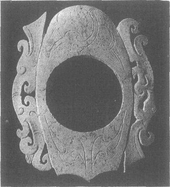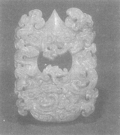 鸡心玉佩西汉早期。长5.2厘米,宽4.1厘米,厚0.3厘米。1968年河北省满城县中山靖王刘胜墓出土。河北省文物研究所藏。玉料为白色,下圆上尖,一面微凸,形似鸡心,中有一大圆孔。两端以阴线刻流云纹,两侧各透雕一只凤鸟,虽形态不同,但给人以平衡之感。这种玉佩是西汉玉器工艺品中的新品种,有人根据它的形制推测可能是从商代玉(戴于手指,用以钩弦射箭的器物,俗称扳指)发展而来。同类器物在江苏铜山小龟山西汉墓也有出土。刘胜见镂雕双螭龙纹玉璧条目。