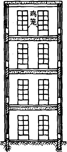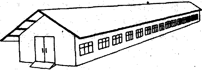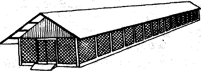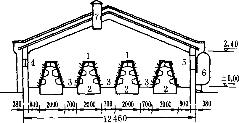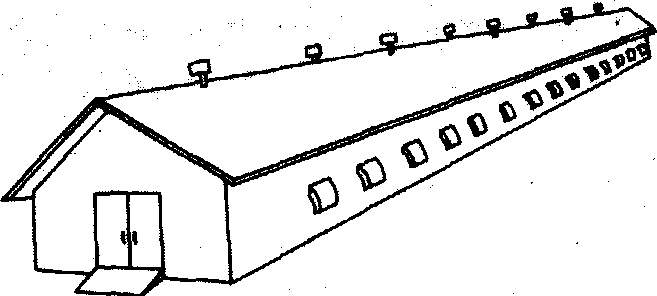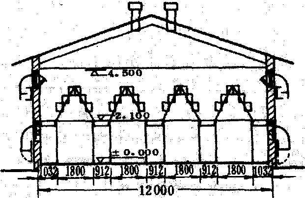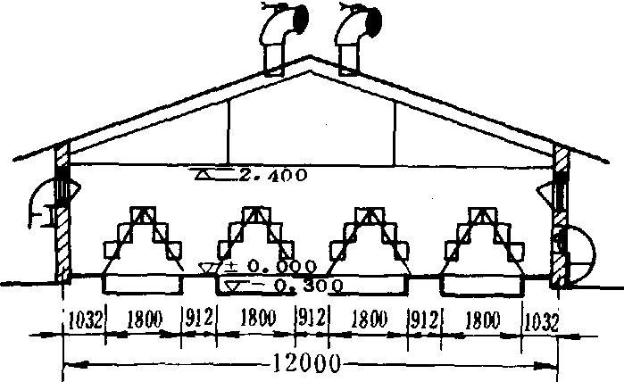 (d) 高床全阶梯鸡舍 图6 高床全阶梯鸡舍 鸡舍结构 在发达国家,鸡舍结构多采用薄壁型钢承重,用高效绝热性能的墙板组装,具有重量轻、安装快的特点。中国的鸡舍结构,通常采用砖墙承重,钢木屋架,粘土瓦或石棉瓦屋面;或砖墙承重,钢筋混凝土屋面架或钢筋混凝土组合屋架,上铺加气混凝土板或钢筋混凝土(预应力钢筋混凝土)空心板(需做保温)的油毡屋面。鸡舍的跨度一般为6~12米,长一般不超过100米。平养和笼养鸡舍舍内净高一般为2.4~2.8米,半高床笼养鸡舍为3.2~3.5米,高床笼养鸡舍为4~4.5米。墙体厚度根据热力工程要求计算确定。内墙面要便于清扫、消毒。屋面能防水、保温。地面多采用水泥地面有一定排水坡度,且便于清扫、消毒。工作间多设在鸡舍的一端,如鸡舍长度超过120米,工作间多设在鸡舍中部。