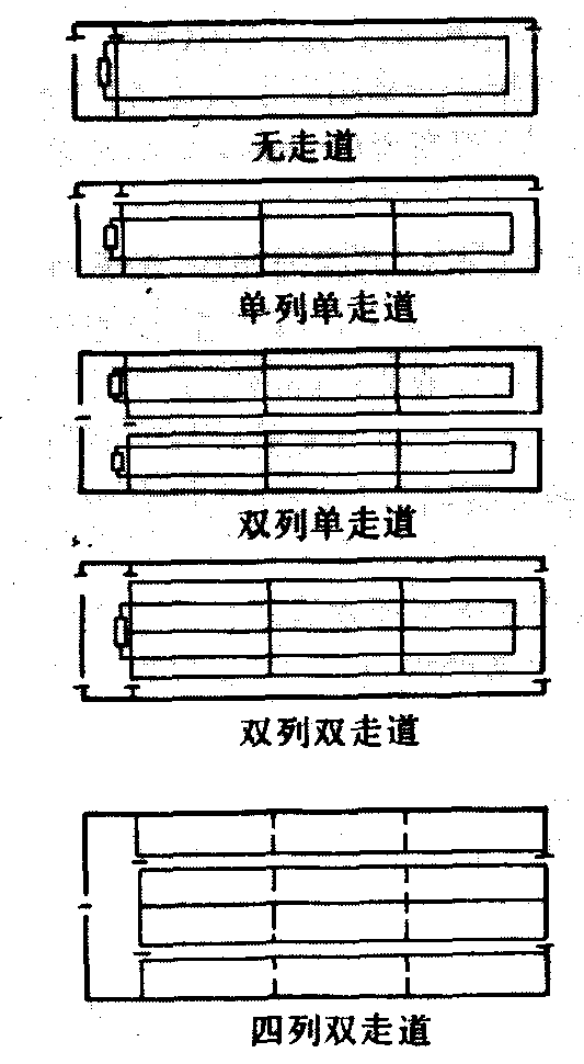 图2 各种平养鸡舍排列形式 笼养鸡舍饲养密度大,鸡舍建筑面积利用率高,土建投资相对降低,蛋鸡90%以上采用笼养。此类鸡舍分为阶梯式笼养、高床式笼养和叠层式笼养鸡舍。阶梯式笼养的鸡笼为2~3层,中国一般采用3层阶梯笼,各层鸡笼错开成阶梯形,鸡粪直接落入地面粪沟内(图3)。半阶梯笼,笼层之间有2/3~1/2的重叠,在笼子的重叠处装有倾斜承粪板,鸡粪沿承粪板落入粪沟内(图4)。一般阶梯式笼养,沿墙设走道,常见的有二列三走道、三列四走道、四列五走道等形式。高床笼养是把鸡笼布置在距地1.6~2.0米,下层为积粪层。高床笼养鸡舍有平置笼和阶梯笼两种。高床平置式笼养鸡舍把鸡笼布置在一个平面上,用链板式喂料机或行车送料,传送带集蛋(图5)。高床阶梯笼养鸡舍设有走道(图6)。为节省建筑投资亦有半高床鸡舍,把鸡笼布置在距地1.2米左右。叠层式笼养鸡舍,各层鸡笼重叠,每层笼底部设有水平承粪板,鸡粪落在承粪板上,再用刮粪板刮入粪沟。鸡笼为3~4层,常采用双列三走道布置(图7)。