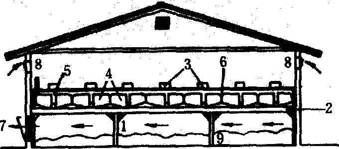 (c) 高床平置笼笼养鸡舍 图5 高床平置笼笼养鸡舍 1.支柱; 2.床面; 3.料箱; 4.鸡笼; 5.料槽; 6.水槽7.排风口; 8.进气口; 9.积粪