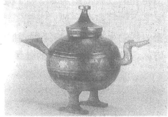 鸭形黑陶尊战国时期陶器,1974~1978年河北省平山县三汲公社战国中山王墓出土。通高二十七点八厘米,长三十厘米。器形模仿野鸭的形象,上有高顶圆钮盖,小口、直唇,球形腹,平底,一对短腿蹼足,前有鸭头为流,后有鸭尾为扳手。器表经磨光并缀以压划花纹为装饰,古朴典雅,造型极佳,设计构思巧妙,是一件难得的精致艺术佳品。黑陶,即黑色陶器,是在强还原气氛中进行渗碳烧制的,和以氧化气氛烧制的红陶,及以弱还原气氛烧制的灰陶相比,标志着陶器烧成技术的更加进步。黑陶采用轮制法制成,器型规整,胎体薄厚匀称,器表乌黑光亮。黑陶工艺在造型上最具特色,器形以盆、豆、杯、翚、罐等最为常见。在新石器时代的大汶口文化、龙山文化、屈家岭文化和良渚文化等遗址中时有发现。现藏于河北省博物馆。 |