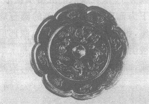 唐。直径14.2厘米。浙江省金华地区文物管理委员会藏。铜镜作八瓣葵花形,背面中央有半球形素钮,钮两侧峙立两只立于折枝花朵之上的鸳鸯。钮上下饰有飞腾云龙,其间配置花枝、流云。外区饰蜜蜂和流云纹。边厚实,略向上卷。