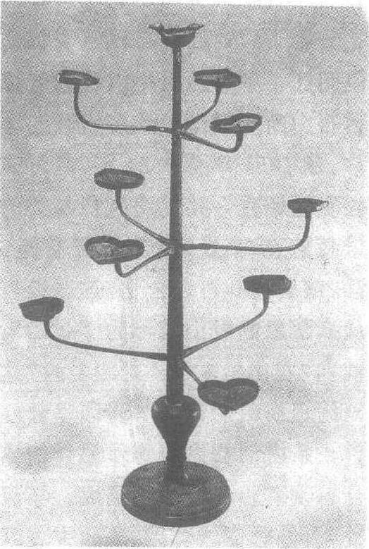 西汉。通高85厘米。1976年广西壮族自治区贵县罗泊湾1号墓出土。广西壮族自治区博物馆藏。此灯圆形底座,座上铸一灯柱,作为灯的主干,从主干向外分出三组枝杈,每组三枝,每杈承桃形灯盏一台,盏内各有一插扦。柱顶端立一鸟。灯盘底座上有弦纹三周。灯用榫铆套扣成一体,可拆卸,十分方便。