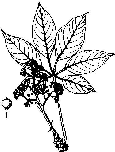鹅掌柴ivy tree,common scheffleraSchefflera oc-tophylla (Lour.) Harms,又称鸭脚木。五加科,鹅掌柴属。小乔木,高达15 m。掌状复叶,小叶6~9,椭圆形,长9~17 cm,宽3~5 cm,幼时密被星状毛,网脉不显。大型圆锥花序顶生,被星状毛;花白色,芳香;萼裂片5~6;花瓣5;雄蕊5;子房下位。核果球形。分布于云南、广东、海南、广西、福建、台湾、湖南、浙江南部及西藏东南部,垂直分布从东部低海拔至西部2 100 m以下山区;日本、印度、越南也有分布。喜光,宜深厚酸性土,稍耐瘠薄,速生。木材轻软,纹理细致,供火柴梗、蒸笼、木履等用材;福建山区用其培养银耳。花为冬季蜜源。根皮、茎皮入药,能舒筋活血、消肿止痛。