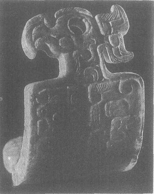鹦鹉首拱形玉饰1986年江苏省吴县严山出土,吴县文物管理委员会藏。为春秋吴国王室宫廷玉器。长8.4厘米,宽3厘米。色淡绿,有深绿色瑕斑,拱形,两端分别琢雕鹦鹉头部形象,高冠大目,钩喙,边缘处饰羽纹,两鹦鹉联接部,即其身驱部分末作细致雕刻,仅作省略的图案处理,使全器主题突出,虚实相宜,整体造型、构图以及雕琢工艺均佳,为同时期同类器物中少见。是研究东周时期吴国社会风俗与文化艺术的珍贵资料。 |