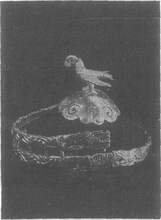 | 释义 | 鹰形金冠顶、金冠带战国。冠顶高7.3厘米,冠带长30厘米,周长60厘米。共重1394克。1972年内蒙古自治区杭锦旗阿鲁柴登匈奴墓出土。内蒙古自治区博物馆藏。此鹰形金冠顶系一展翅雄鹰立于半球形体上。鹰身由金片作成,身体为空心,周身显出图案化的羽毛。鹰头与颈部之间饰一带花边的金片,形似项链。在头部和颈部尚镶嵌两块绿松石。鹰鼻内及尾部均向体内插入金丝,与腹部相连,使头、颈和尾部可以左右摆动。鹰形金冠顶下部的半球形系由金片锤成,球面上由四只狼和四只羊组成的浮雕,它们相对而卧,构图极紧凑,富于装饰性。整个金冠饰构成了雄鹰鸟瞰狼羊咬斗的生动场面。金冠带系由三条半圆形金带组合而成。冠带前部由两条上下相接,末端用榫铆连接。冠带两端有卧状虎、马及盘角羊等浮雕,其他部分饰绳索纹。以上两件器物均属上乘佳作,在制作技法上,除了使用传统的铸造法外,还使用了压印、锤揲、抽丝及镶嵌等工艺,它们代表了战国时期匈奴地区贵金属工艺的最高水平。