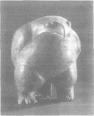 鹰鼎 鼎,是我们祖先发明的 一种蒸煮食物的炊具。它的形状,一般上部呈碗或者锅状,下部为三足,有实足和空足之分,便于烧火、蒸煮食物。但这种却是以鹰隼造型的。鹰尖嘴、勾喙,两只外凸的大眼睛发出攫取的光,森森然使人生畏。鹰的双足粗大、劲健有力,与尾部巧妙地分成三个支点,十分稳定。这里,我们不难看到,原始艺术家在把握苍鹰特点以及运用变形方法,使之与器物浑然 一体的造型本事。 以动物为对象的拟形器大都是实用的器皿。这件鹰鼎高36厘米,没有器耳和把手,又出于墓葬之中,所以实用的可能性不大。有 一种估计,认为它是作为祭祀用的礼器。 以动物造型的陶器对后世的青铜器的题材和处理手法都有很大影响。 |