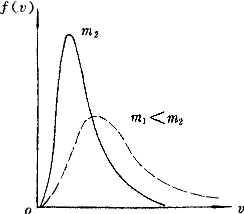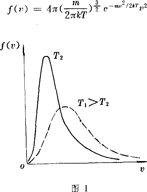 其中k是玻耳兹曼常量,T是热力学温度,m是分子的质量,v是分子热运动的速率。f(v)的曲线(如图1)称为速率分布曲线,由曲线可知,速率取极大或极小的分子很少,多数分子速率取中等大小值。对于给定的气体(m一定)速率分布曲线的形状随温度变化,图中虚线与较高的温度T1对应,实线与较低的温度T2对应。比较两条曲线可知,当温度升高时分布曲线的峰向右移,速率大的分子数增多,速率小的分子数减少。在同一温度下,分布曲线的形状随气体分子的质量大小变化,图2中的虚线与m1对应,实线与m2对应,m1