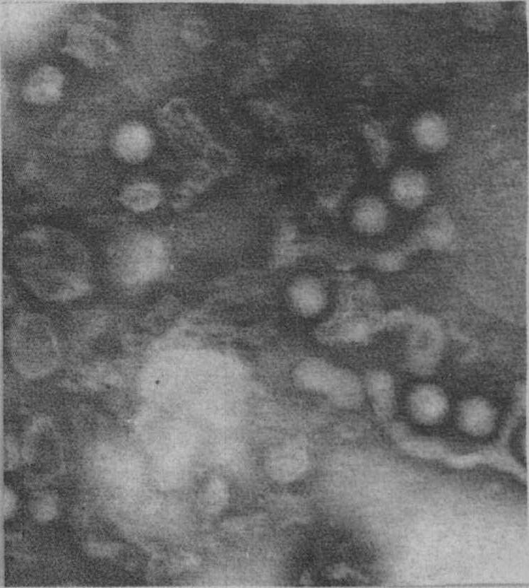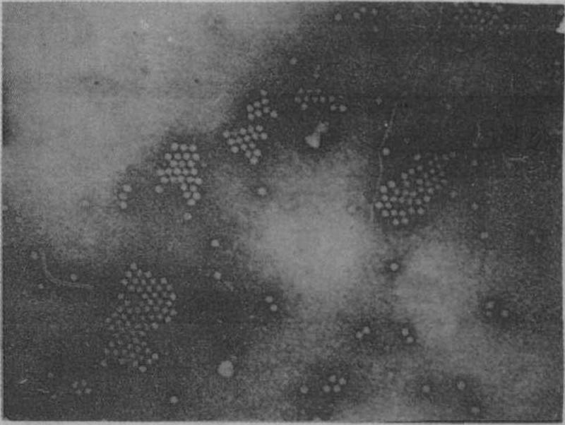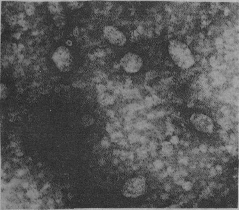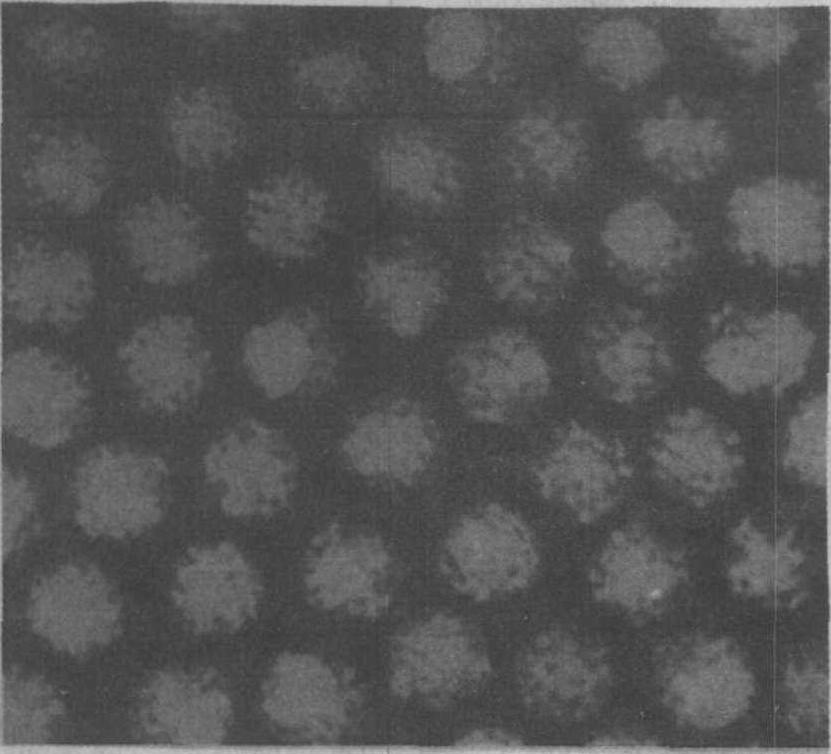 图3 急性麻痹病病毒(×2×105) 缓慢性麻痹病病毒(Slow paralysis virus,简称SPV)为等轴二十面体球型病毒,直径为30纳米(图4),沉降系数为176S,在氯化铯中的浮密度为1. 37克/毫升,蛋白质分子量为2.7×104、2.9×104和4.6×103,与上述3种麻痹病毒无血清学关系,病毒注射成年蜜蜂体后12天左右死亡,死亡前一两天,前两对足出现典型麻痹症状。