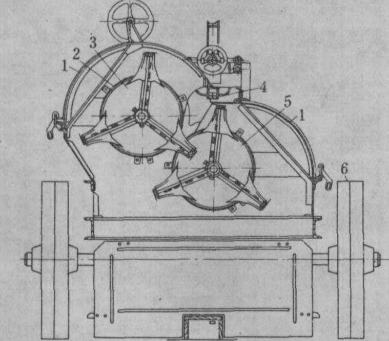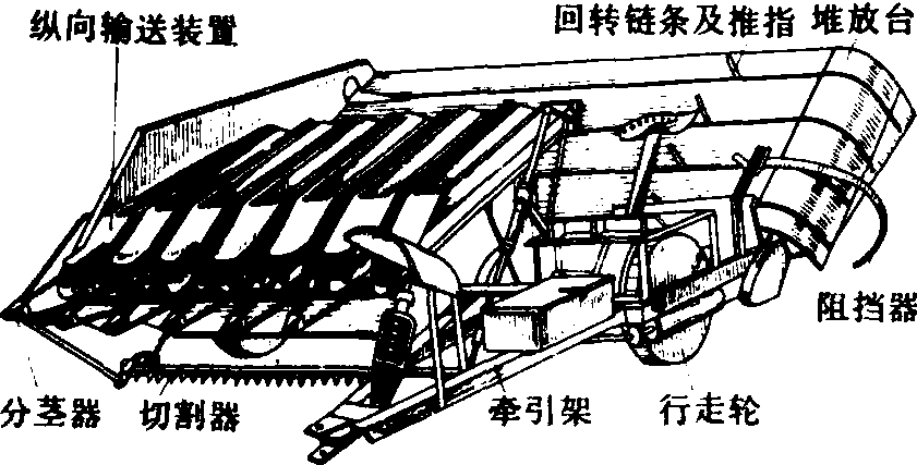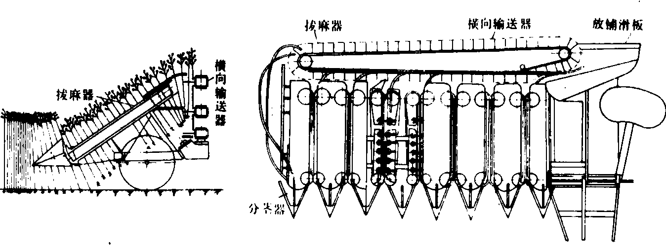 图1 拔麻机 割麻机 用于大麻和黄麻等收割,一次完成割取和堆放麻杆作业,其结构如图2。在该机的前下方装有可上、下浮动的往复式切割器,切割器上方装有分茎器和纵向输送装置,机器的后方装有茎杆堆放台和推指式堆放机构。工作时,分茎器将麻杆引向纵向输送装置,继而由切割器将麻杆从根部割断,麻杆在纵向胶带输送器的夹持下送至堆放台。堆放台上有若干条回转链条,每个链条带一个推指,链条每回转一周,推指将堆放台上的麻杆推向地面一次,借此实现间歇性堆放麻杆。由于在麻杆根部处设有阻挡器,使麻杆落地时茎杆梢部向外转动一个角度放成铺,以便人工分把捆扎或捡拾。一台7行大麻收割机(割幅为2.1米)的生产率为0.9公顷/小时左右。