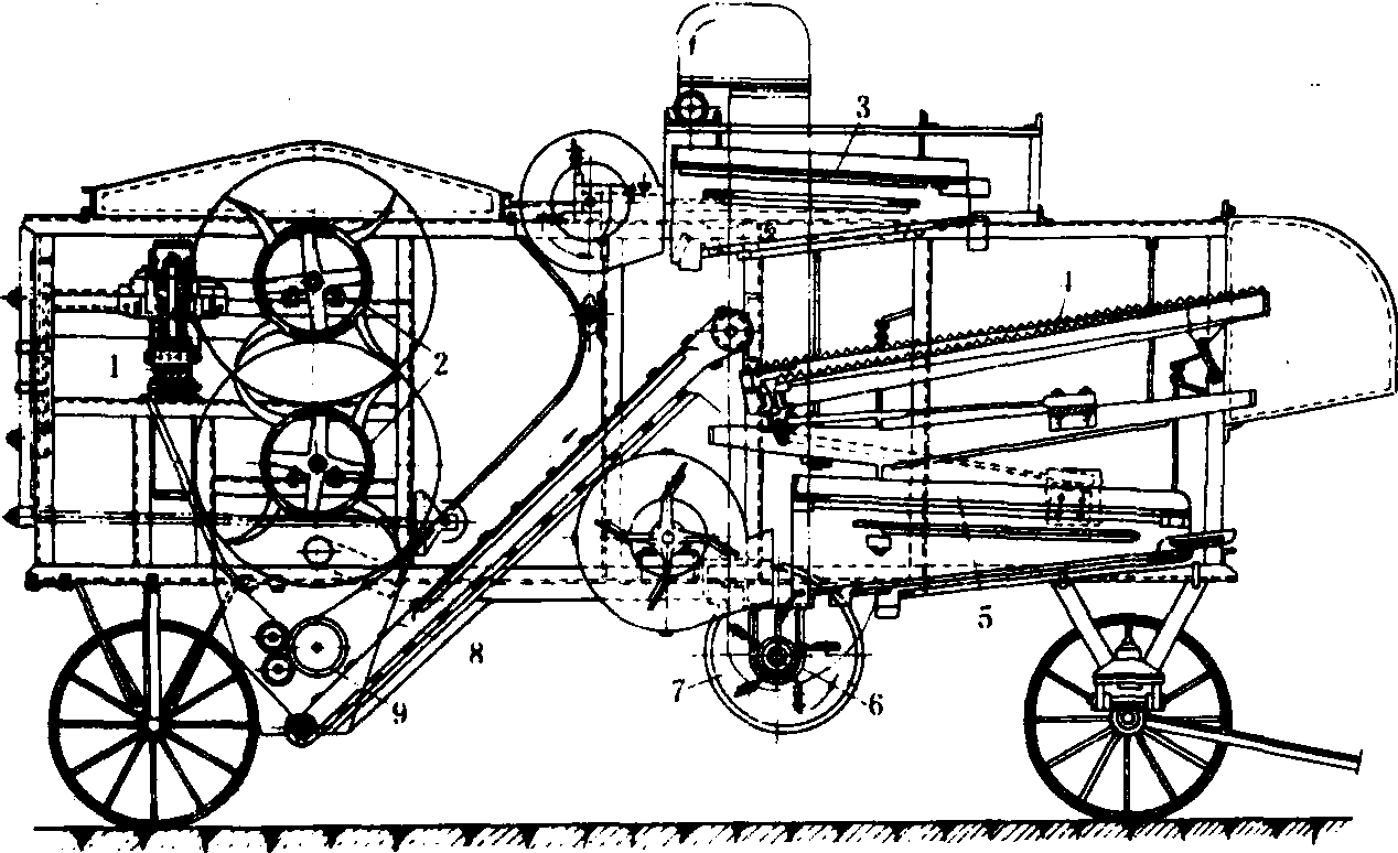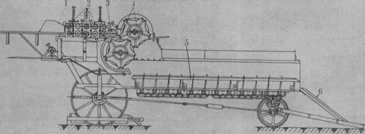 图2 割麻机 脱粒机 有简式、半复式和复式三种。简式脱粒机只将花序上的蒴果脱掉,不进行其他作业。半复式脱粒机除脱掉蒴果外,还将蒴果碾碎并分离麻籽。复式脱粒机能完成梳脱蒴果、碾压蒴果、分离麻籽和清选麻籽等作业。 复式亚麻脱粒机主要由麻杆夹持输送器、一对梳脱滚筒、碾压装置、倾斜输送器、逐稿器、第一清洁室、第二清洁室、升运器、抛掷器等组成(图3)。工作时,麻杆根部被夹持输送器夹持并沿着平行于梳脱滚筒轴线方向运动,梳脱滚筒从亚麻茎杆上将蒴果梳掉。蒴果进入碾压器,经碾压后其果皮及麻籽落入倾斜输送器,被送至逐稿器,在逐稿器的抖动下,将果壳等大杂物送出机外,麻籽从键孔漏下落入滑板并流入第一清洁室。轻杂物在第一风机的作用下,被吹出机外,未碾碎的蒴果从筛尾落入抛掷器,被送至碾压器进行复碾。麻籽等小杂物从筛孔漏下,经升运器进入第二清洁室复清,得到较纯净的麻籽。一台装有7.5~9千瓦动力的亚麻复式脱粒机,生产率为2.5吨/小时左右。 复式大麻脱粒机与复式亚麻脱粒机相似,主要由夹持输送器、梳脱滚筒、碾压器和清洁室组成。蒴果则在两对梳脱滚筒的配合作用下被梳掉。 联合收获机 常用的是亚麻联合收获机。由拔麻台、装有梳脱滚筒的梳刷室、夹持输送器、捆束装置、行走装置和传动机构组成。拔麻台上的拔麻器和横向输送器的结构与拔麻机相同。工作时,亚麻由拔麻器拔起经横向输送器,再由夹持输送器将其送入梳脱滚筒。滚筒装有4把梳齿,梳齿借助平行四杆机构的控制,在滚筒回转中保持方向不变,4把梳齿轮流插入麻杆花序部分将蒴果梳掉。梳脱滚筒的轴线与夹持输送带的运行方向线偏一角度,这样可使梳齿对亚麻的梳脱作用逐渐深入,从而减少梳麻过程中造成的断麻量。梳落的蒴果经升运器进入蒴果箱,麻杆由夹持输送器送入捆束装置并捆成小束抛出。有的亚麻联合收获机没有捆束装置,但设有铺放滑板,将麻杆铺放在地面上。 碎茎机 主要部件是5~6对上下连续布置的带凸纹的轧辊。上排各轧辊的轴承座上方装置的压缩弹簧调节改变轧辊的压力。工作时将亚麻(大麻)纵向薄层喂入轧辊,麻杆经几对轧辊的多次压揉和弯曲使其韧皮与麻骨分离。为了减少轧辊对纤维的损伤,各轧辊的凸纹数不同,一般有11~14个凸纹,轧辊直径为120毫米左右,轧辊转速为100~135转/分,各轧辊线速度为0.6~0.8米/秒。大麻碎茎机为了清理韧皮,常将部分轧辊的速度比一般的提高一些,以增强对韧皮的碾搓作用。工作幅宽为600~700毫米的亚麻碎茎机的生产率为350~500千克/小时。