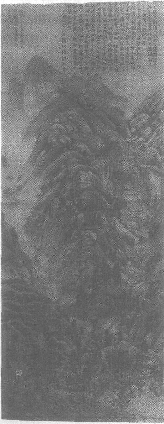 | 释义 | 黄公望天池石壁图轴元。黄公望绘。绢本设色。纵139.4厘米,横57.3厘米。北京故宫博物院藏。黄公望,元代文人画的领袖人物,为“元四家”之一。图中雄峰层叠而起,巍峨高拔。千岩竞秀,气势苍浑。左侧临对高深莫测的渊涧,一块突出的平岩高悬于半空之中,危绝险奇。右侧凭览宽展曲转的壑谷,流瀑飞挂如线,清溪寒泉穿水榭,跨巨石,奔涌而出。山上山下,乱石累累,烟岚轻笼,远峰微茫,万木峥嵘,青翠郁盛。楼馆亭台掩映于丛林幽谷之间。此轴以高远构图鸟瞰山间全景,而上下内外各处景观又以散点透视的方法作具体描绘,物象繁密而用笔疏简,墨色润厚华滋,整个画面蕴含着一种苍浑雄劲的动势。此图是黄公望浅绛山水中的名作,传世摹本甚多。此真本中作者自署:“至正元年十月,大痴道人为性之作天池石壁图,时年七十有三。”至正元年是公元1341年。画幅上端有元人柳贯的题记。《大观录》、《寓意编》著录。