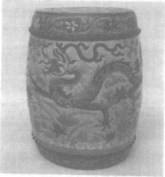 明万历。高34.1厘米。上海博物馆藏。瓷坐墩,宋时已制作,形制为鼓形,造型敦厚古朴,明代的墩面普遍隆起。此座墩以黄色为地,以绿紫两彩绘双龙、莲荷并以缠枝纹和海浪纹为边饰。万历时期的三彩有各种色地,其彩均直接施于胎坯上,以黄釉为地的三彩最为常见。