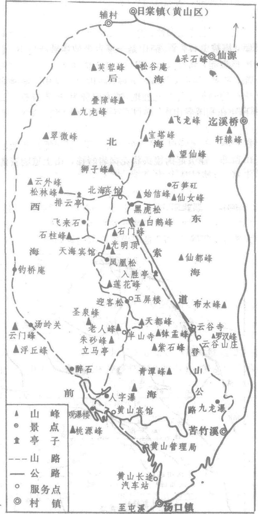 黄山位于安徽南部黄山市境内。风景区面积约1200平方公里。中国最著名的风景区之一。徐霞客赞称“五岳归来不看山,黄山归来不看岳”。“黄山四绝”可概括风景的特点:1.奇峰怪石,有莲花峰、天都峰、始信峰、石笋林、飞来石、猴子观海、梦笔生花、蓬莱三岛、关公挡曹、鳌鱼驮金龟等;2.云海,每年约200天有云雾,四季可见。文殊台、清凉台、排云亭、光明顶等是观云海佳处;3.奇松,有迎客松、送客松、蒲团松、凤凰松、黑虎松、卧龙松、棋盘松、探海松等;4.温泉,平均每小时涌水48吨,水温常保持42℃,水质清澈,可饮可浴,富有医疗价值。1000多年前就已利用,现辟温泉浴室和温泉游泳池。中华人民共和国成立后建为黄山公园。参见“地理”中的“黄山”。 黄山位于安徽省黄山市境内。为世界著名游览胜地。方圆250公里。黄山山峰奇特,直插入云,气象万千。苍松翠柏,形状怪异,千姿百态。烟云雾海,飘渺如入仙境。著名胜景有二湖、三瀑、二十四溪、七十二峰。天都、莲花、光明为黄山三大主峰。迎客松、梦笔生花、飞来石、猴子观海、人字瀑更是让人神往。奇松、怪石、云海、温泉,堪称“黄山四绝”。泰山之雄伟、华山之峭峻、衡山之烟云、庐山之飞瀑、峨眉之清凉,皆集于黄山,明代地理学家徐霞客有“五岳归来不看山,黄山归来不看岳”之誉,一点都不为过。 黄山随着旅游业的发展,饮食业、服务业和商业也蓬勃兴起。黄山风景区内的黄山宾馆、北海宾馆、玉屏楼宾馆依山而建;在桃花溪畔、群山万峰之中,听涛居、散花精舍、翠明轩等仿古徽派旅游建筑群,傍山而立,错落有致;一排排鸳鸯竹楼,散落在万绿丛中,若隐若现,疏朗有姿。农家旅社如雨后春笋,散布在景点周围,为多层次游客所喜爱。 抗战时期曾有“小上海”之称的屯溪区内有屯溪饭店、华山宾馆、江心洲宾馆、花溪饭店、徽州宾馆等大中型高档旅游饭店。1989年全市有各类宾馆、旅社325家,床位33000多张,其中带有卫生间设备的床位近7000张。以屯溪商业大厦、黄山友谊商店、屯溪水心亭商场为中心的经营日用工业品、五金交电、副食、饮料、旅游纪念品的商业大厦、营业楼房、网点建筑古色古香,十分雅致。1989年全市商业网点14283个,从业人员34965人。区内享有“东方古罗马”盛誉的、具有明清建筑风格的屯溪老街,长达1.5公里,古朴雅致,引人入胜。牌坊楼屹立街头,石板街道两侧,店铺招牌、酒帘错落醒目,依山傍水新辟的大庆路、延安路、大寨路、车站路等热闹的商业大街,林荫蔽宇,网点密布,群楼栉比,新区与老街交相辉映,欣欣向荣。主要街道从西镇街、老街连接黄山西路、黄山东路至前园北路一条线有3.5公里长。跃进路、公园路、新安路作为商业辅助网,屯光、隆阜、阳湖、高枧四乡则形成围绕市区的卫星镇。