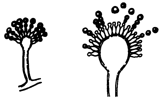 黄曲霉的分生孢子梗 黄曲霉和烟曲霉(仿Dade) 症状 幼虫患病后,最初呈苍白色,后变淡褐色或黄绿色,僵硬如石; 体表长满白色菌丝和黄绿色孢子,常充满巢房的一半或整个巢房,若轻轻震动就会四处飞散。大多数患病幼虫死于封盖之后。成蜂罹病后表现不安,逐渐虚弱无力,不能飞翔,反应迟钝,常爬出巢外死亡。 传播 主要通过落入蜂蜜或花粉中的黄曲霉孢子传播。蜜蜂或幼虫食入被病菌污染的饲料,孢子就在肠道里萌发,形成菌丝,受害个体内脏组织很快被菌丝长满,最后穿透表皮,在靠近体壁的前端长出,在虫体表皮上密集生长,两三天内形成一层假皮。暴露在空气中的菌丝开始形成分生孢子。 诊断 在症状诊断的基础上,可挑取幼虫尸体表面物少许,通过镜检,若发现有呈球形或三角烧瓶形的疏松分生孢子头,并有许多呈圆形或近圆形,带黄绿色、表面粗糙的分生孢子时,即可诊断为黄曲霉病。 防治 主要采取换箱换脾、蜂具消毒和结合药物治疗的综合防治措施。首先除去病群内所有的病虫脾和发霉的蜜脾和粉脾,加入清洁无病菌的巢脾供蜂王产卵。换下的巢脾在15%甲醛加5%氢氧化钠溶液中浸泡6小时,或在10%过氧化氢加0.5%甲醛溶液中浸泡4小时,除去消毒液,用清水冲洗,晾干备用。患病蜂群可用0.1%灰黄霉素水溶液喷脾一两次,再用0.1%灰黄霉素糖浆饲喂两三次。或用0. 1%麝香草酚糖浆进行饲喂,每隔3天1次,连续治疗三四次。使用前,将麝香草酚先用95%酒精溶解后再加入糖浆内。 |