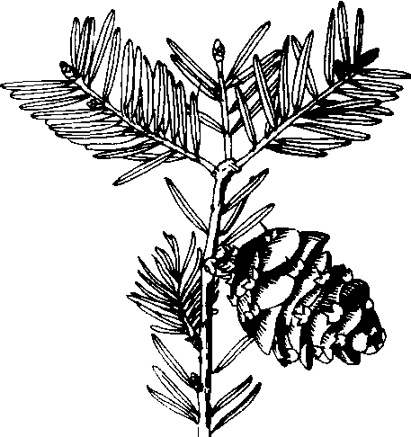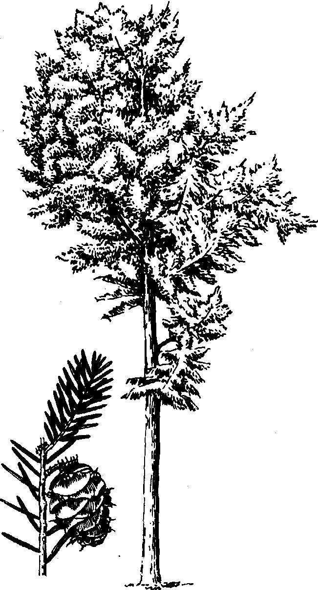 黄杉Chinese douglas firPseudotsuga sinensis Dode,松科,黄杉属。常绿大乔木,高达50 m。树皮灰或深灰色,裂成厚块片。小枝淡黄或淡黄灰色,干后褐色。叶条形,长1.3~3 cm,排成二列,先端钝圆,有凹缺,上面中脉凹下,下面有两条白粉气孔带。球果当年成熟,卵圆形或椭圆状卵形,长4.5~8cm,径3.5~4.5 cm;种鳞近扇形或扇状斜方形,背部密生褐毛;苞鳞3裂向后反曲,中裂较长,窄三角形,长3 mm。种子三角状卵圆形,长9 mm,被短毛。种翅较种子长。分布于湖北、湖南、贵州、四川、云南,东部海拔800~1 200 m,西部1 500~2 800 m地带,散生于针阔叶混交林中。喜温和湿润气候,耐冬春干旱,适生于山地红壤、黄壤或棕色森林土。喜光、幼年稍耐阴,疏林地上天然更新良好。材质优良,供建筑、板料、造船、车辆、家具等用材。为珍贵用材树种,现存林木不多,宜保护母树,并在产区中、高山地带扩大造林。