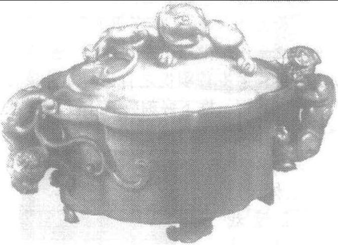 | 释义 | 黄杨木雕三螭海棠式盒清代宫中盛珍贵文玩的陈设品,置于室内多宝格上。此盒通高9.8厘米,口径15.6×10厘米,足径9.8×7.7厘米,造型近似明代铜炉。盖顶伏一头如鹦鹉、貌甚怪异之螭,用作盖纽。盒身左右各有一螭作耳。盒通身呈棕黄色,采用圆雕技法刻制。刀法细腻灵活,线条流畅圆润,螭之形态严谨中现奔放,生动传神。