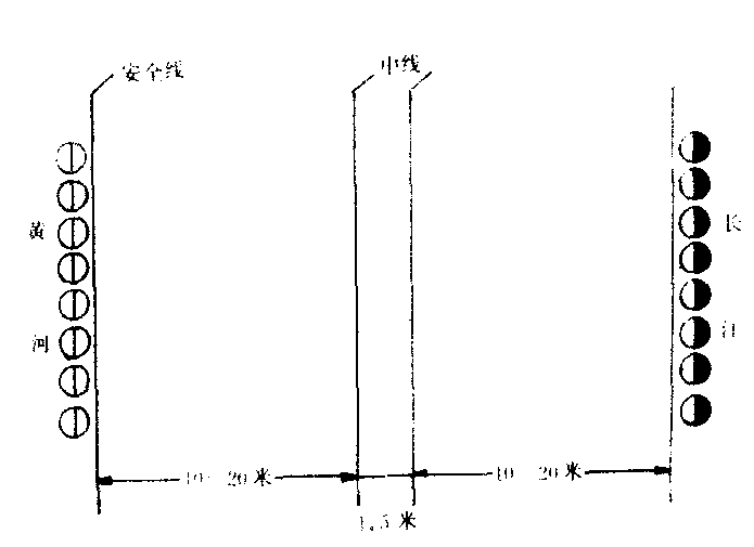 | 释义 | 黄河、长江以“黄河”、“长江”为代号的两队学生,背对背或面对面地在场地上站立(走或跑),听到信号后,互相进行追拍和躲闪的奔跑游戏。游戏准备:在场地中间画两条平行线,相距1.5米作为中线。距两边中线10~20米处,各画一条与中线平行的横线为安全线。游戏方法:把学生分成人数相等的两队,一队代号叫“黄河”,另一队叫“长江”,面对面分别站在两条安全线后。游戏时,两队学生按教师的口令,向中线行进。接近中线时,教师突然喊:“长江!”这时“长江”立即回身跑向安全线,“黄河”则立即追拍,在安全线前拍着对方的得1分。如此轮流反复进行,以累积得分多的队为胜。游戏规则:❶追拍人不得推人、拉人。