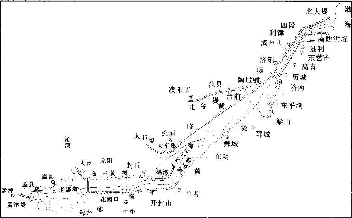 | 释义 | 黄河大堤黄河干流河南和山东两省堤坊。右岸临黄大堤长604.8 km。上段自河南郑州市邙山脚下至山东梁山徐庄,长348.2 km;下段从济南市宋庄至垦利县二十一户,长256.6 km。左岸临黄大堤长718.8 m。上段自河南孟县中曹坡至封丘鹅湾,长171.1 km;中段自河南长垣大车集至台前张庄,长194.5 km;下段自山东阳谷陶城埠至利津,长353.2 km。此外,黄河北岸大堤以北,滞洪区内有北金堤,自河南濮阳市南关至山东阳谷陶城埠长123.3 km;河南孟津县牛庄至和家庙一段长7.6 km;封丘鹅湾至长垣姜堂的贯孟堤长21.1 km;延津魏丘至长垣大车集的太行堤长44 km;山东河口地区垦利二十一户及利津四段以下至河口的两岸临黄堤共长63.6 km。以上两岸大堤和其他堤防总长为1583.2 km。 黄河大堤河南省、山东省境内河道两岸修筑的束范河水的堤防,世称“黄河大堤”。黄河下游堤防工程,远在春秋中期已初步形成,到了战国时期已具有相当规模。明代堤防工程的施工、管理和防守技术都达到了较高的水平。把堤防分为遥堤、缕堤、格堤、月堤4类,按照各堤的特点,因地制宜地修建。现行黄河大堤河南兰考县东坝头和封丘县鹅湾以上是在明清时代的老堤基础上加修起来的,有500多年的历史;以下是1855年黄河铜瓦厢决口改道以后,在民埝基础上陆续修筑的,也有130多年的历史。1949年以来黄河堤防在修、防、管方面都有很大发展。在修堤方面逐渐由人力施工发展为机械施工;在管理方面采用专管和群管相结合的制度;防御洪水的能力大大提高。现行黄河大堤右岸长604.83千米,左岸长718.73千米,另外加上黄河左岸大堤外滞洪区的北金堤、孟贯堤、太行堤等,两岸堤防共长1583.22千米。黄河大堤主要由堤身及附属建筑物坝垛、护滩岸所构成。为防止水流淘刷,在直接临河的堤段上修筑丁坝、垛和护岸工程等,称为 “险工”。不靠河的堤段称为 “平工” 。1950年~1985年3次对黄河大堤全线加高,平均加高2.15米,累计完成土方4.3亿立方米,大堤最大绝对高度达14米。由于多年形成的科学的堤防管理制度和严密的堤防管理组织,现行黄河大堤能安全防御花园口站22000立方米/秒的洪水,艾山以下能防御11000立方米/秒的洪水。