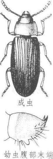 | 释义 | 黄粉虫Tenebrio molitor俗称“面包虫”、“麸子虫”。昆虫纲,鞘翅目,拟步甲科。严重危害粮仓中面粉、麸皮、油料等的害虫。幼虫体呈圆柱形,近似金针虫,淡橙黄色,长约2~3厘米,体间有黄褐色环纹,适于饲喂小型和大型软食观赏鸟。虫体含有丰富的动物性蛋白质、多种酶和维生素,对鸟体生长发育和健康极为有利。可用内壁光滑的搪瓷脸盆进行人工饲养,不仅方法简便,一年四季均可获得足够量的幼虫。 黄粉虫yellow mealwormTenebriomolitor L.,昆虫纲,鞘翅目,拟步甲科。世界性广布种;中国分布于黑龙江、辽宁、甘肃、河北、山东、山西、四川。为害贮粮、面粉、面包、饼干。成虫体长约15 mm,长椭圆形,深褐色,有光泽。前胸背板宽,前缘凹入,前角钝,后角尖。鞘翅有纵点行,鞘翅末端钝圆。末龄幼虫体长约30 mm,背面黄褐色,腹末臀突尖端上翘的方向和虫体背面几成直角。中国一年发生1代,以幼虫在仓内缝隙、底粮、尘芥中越冬。成虫夜间活动,善飞。卵单产或集产在粮食表面,卵外沾附碎屑。成、幼虫均喜群居、潮湿。幼虫17~19龄,常作观赏鸟的饲料。成品粮宜保持纯净,以免生虫。虫粮可采用物理机械及缺氧保管等方法除治。