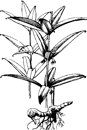 黄精 黄精一种滋补药材。产于桂西北各县,其中以凌云、乐业县为最多。黄精属百合科,多年生草本植物,野生,多生长在山坡树林之下。茎长,较软弱,叶3至6枚轮生,线状披针形,先端无柄卷曲,缠绕它物。夏季开花结实,花呈金红色或鲜红色,籽粒落地翌年发芽。冬季茎叶枯萎,地下根茎薯块一年多长一节,方圆形,薯皮黄白,肉黑褐色,富有糖分,食之味甜,供药用。加工方法:生黄精洗净后,按先煮后蒸的程序,一般经两煮两蒸,然后晒干,使之颜色呈鲜黑色,有光泽为止。黄精肉质肥大,味甜,主要用于浸酒,能治虚损、益精,并能补血,是滋补名药。 黄精别名鸡爪参、西伯利亚老虎姜。多年生草本,高30—60厘米。根茎横走。茎单一,直立。叶互生或近轮生,披针形或线状披针形。花腋生。果球形,鲜红色。天山、阿尔泰山和昆仑山山区有分布。具有养阴润肺、生津益胃的功能。药用根茎。主治风湿性心脏病、多种急性传染病后期、胃口不好、神经衰弱、失眠、缺铁性贫血、肺结核低热等病症。杀虫植物,对稻螟、小麦秆锈病、小麦叶锈病、孑孓有效。 黄精特产中药材。分布于湖南省各地,以衡阳最盛。黄蔓精之简称,又名轮生玉竹,生长在荫坡、石壁、杂草丛中和树下。为多年生草本,根茎横走,先端有时突出似鸡头状。茎直立,高50~90cm。叶轮生,每轮4~6枚,线状披针形,先端卷曲。花夜生,常2~4朵小花,下垂,花被筒状,白色至淡黄色,先端浅裂,雄蕊6枚,花丝较短。花柱长,为子房的1.5~2倍。浆果球形,成熟时黑色。花期5~6月,果期7~9月。黄精入药性平而润,味甘而淡,无毒而杀虫; 其功能补中益气,定肝胆,润心肺,益脾胃,升清气,降浊气,填精髓,壮筋骨,降风湿,下三火,还可润大便,利小便,使人目明耳聪。《本草纲目》:“服(黄精) 亦不论多少,一日不隔即去老还少。” 清版《泰山县志》引陶弘景语谓之“仙人遗粮”。本品食法与众不同,砂锅煮沸晒半干以白糖淹之,二日后即可取食,晒干为末而糊食亦可。南岳盛产黄精,“叶如竹箭垂多实,根似葳蕤秀一枝,二月向阳峰上茁,三春通润井旁滋”。这首诗概括了南岳黄精生长情况。旧志上说: “岳产黄精,品之佳者,服之可以延年。” |