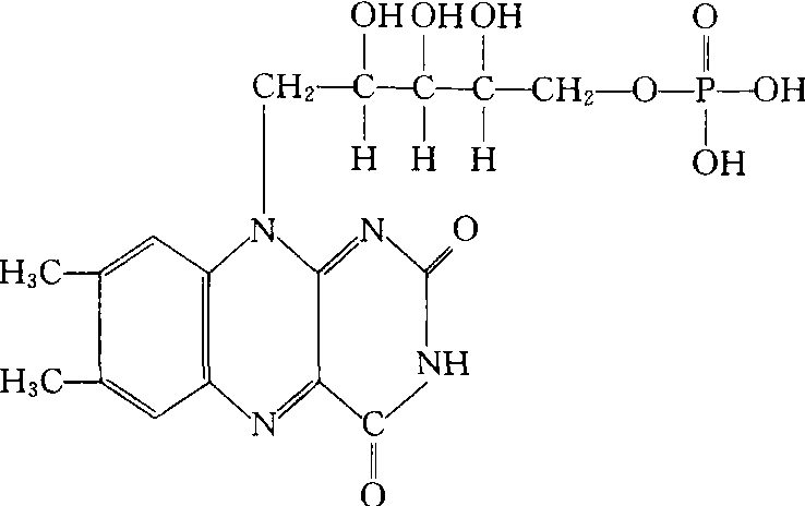 核黄素磷酸酯。有氧化型和还原型两种形式,分别简写成FMN和FMNH2。含有维生素B2,是一种假核苷酸。在氧化还原反应中,分子中的异咯嗪环可以可逆地进行加氢和脱氢反应。为一些需氧或不需氧脱氢酶或黄素蛋白的辅基,在生物体内一般起递氢作用。
