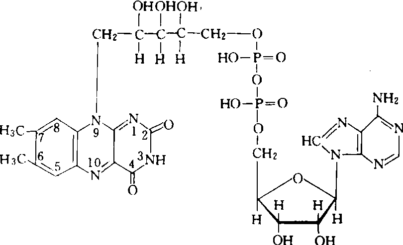黄素单核苷腺嘌呤核苷酸酐。有氧化型和还原型两种形式,分别简写成FAD和FADH2。含有维生素B2。作用机制同黄素单核苷酸。为一些需氧或不需氧脱氢酶或黄素蛋白的辅基,在生物体内一般起递氢的作用。