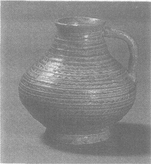 西周。高13.9厘米,口径6厘米。1959年安徽省屯溪市出土。北京中国历史博物馆藏。壶侈口,短颈,溜肩,硕腹,圈足,颈腹间安一桥形鋬。通体有弦纹和一道道点状纹,装饰性很强。外表施黄褐色釉,釉色莹亮,其呈色具有安徽地区墓葬出土的原始瓷器的典型性。原始瓷见“青褐釉原始瓷尊”条目。