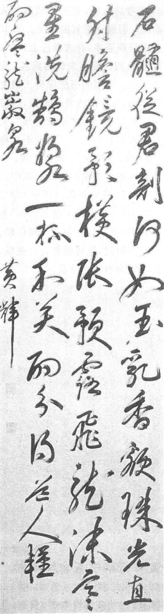 | 释义 | 黄辉行草书五言律诗轴明。纸本。纵349.4厘米,横104厘米。四川省博物馆藏。黄辉,生卒年不详,字平倩,一字昭素,号无知居士,四川南充人。幼颖异,博览群书,年十五举乡试第一,万历十七年进士。官至少詹事兼侍读学士。刻意学古,以韩欧为师,书画推董其昌,诗和书与董齐名。楷书法钟繇,擅行、草,挥运所及,辄自成体。明陶宗仪《书史会要》云:“辉楷法钟元常,亦作行书。”著有《铁庵集》八十卷,《平倩逸稿》六十六卷。《明史》卷二百八十八有传。此幅五言律诗:“石髓从君剖,何如玉乳香,额珠光直射,瞻镜影横张,预露飞龙沫,寒星洗鹄浆,一杯和笑酌,分得道人粮,酌盘龙严泉。”款署“黄辉”。款下钤白文〈黄辉之印〉、〈慎轩〉两印。行草书具有深厚的功力,笔锋提按顿挫有力,秃笔率真,勾连使转飘逸厚重,有气势磅礴、苍老雄健的审美意象。