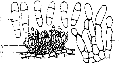 黏隔孢属 1.分生孢子梗 2.分生孢子盘 3.寄主表皮 4.分生孢子 |