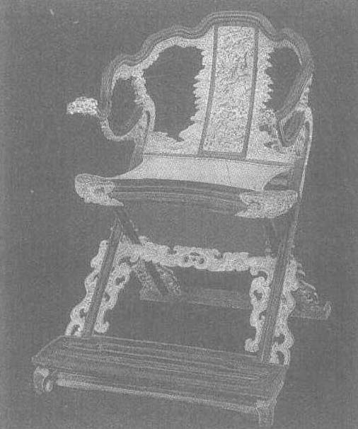 | 释义 | 黑漆金髹龙纹交椅清康熙。面长52.5厘米,深41厘米,座高58厘米,通高105.5厘米。北京故宫博物院藏。椅背外廓如半环卷荷叶,两边搭脑各雕一龙头,并饰金髹。软屉椅面。附设脚踏。椅遍髹黑漆,并在靠背、座、腿足等处浮雕、镂雕蟠螭、卷云、海水、二龙戏珠、云水五岳图等纹饰,上饰金髹,显得十分华丽。“金髹”,也叫“浑金漆”或“贴金漆”,即在器物周身贴金箔的装饰工艺。