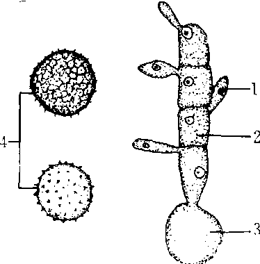 黑粉菌属 1.担孢子 2. 担子 3、4.冬孢子 |
