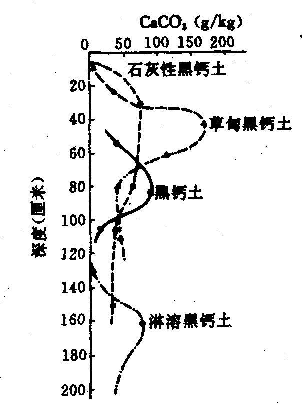 引自《黑龙江土壤》,农业出版社,1992,197页。 主要亚类 根据腐殖质积累过程和钙积过程的强度以及草甸化过程,盐渍化过程等附加过程出现的情况黑钙土分为四个亚类。 淋溶黑钙土 腐殖质层在50厘米以上,在1米到1.5米内几乎不含石灰,有时可能有铁、锰结核。 普通黑钙土 即典型黑钙土,腐殖层厚约30~50厘米; 表层呈中性,在50厘米到1米以内有碳酸钙淀积,呈石灰结核或眼状斑。 碳酸盐黑钙土 腐殖质层厚约20~30厘米,全剖面有石灰反应,表层CaCO2含量可达20克/千克,在50厘米左右可增至50~100克/千克,甚至更多,风大,干旱,易受风蚀,西部与栗钙土相邻。 草甸黑钙土 分布于河谷阶地,地下水位较高处,腐殖质层厚50厘米以上,腐殖质含量较多,(50~80克/千克)质地较粘,下有钙积层,受地下水影响,表层有轻度盐渍化性状,下层有锈斑和铁、锰结核。(见图)。 利用改良 黑钙土有机质和养分丰富,潜在肥力较高。但本区十年九春旱,土壤水分不足,春夏常有大风,夏季多大雨,极易引起风蚀和水蚀。黑钙土适于发展农业和畜牧业,应坚持农、林、牧综合利用的方向。目前存在的主要问题是盲目开垦、广种薄收,引起地力减退和土壤侵蚀。开发农业应选择地形平缓、土层深厚的黑钙土和水分状况较好的草甸黑钙土,且必须配