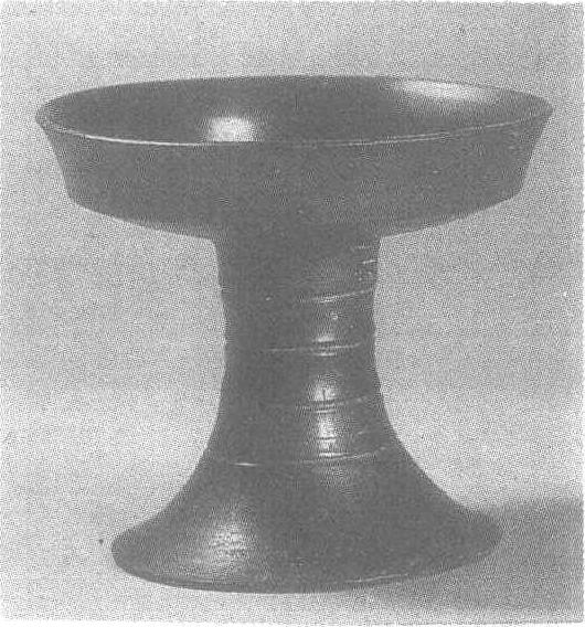 | 释义 | 黑陶豆铜石并用时代龙山文化。高14.7厘米,口径16.9厘米。1955年浙江省杭州市良渚出土。北京中国历史博物馆藏。这件浙江出土的陶豆从造型、工艺上与山东胶县三里河出土的黑陶器极相似。器口外撇,浅腹,高柄呈竹节状,并向足部渐过渡呈喇叭形。器物制作十分规整,造型轻盈优美。细腻的质地和幽幽柔光更加衬托出器物的精致,是一件给人留下深刻印象的作品。龙山文化见“黑陶鼎”条目。