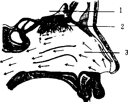 1.脑2.嗅觉区3鼻腔 鼻腔剖面结构示嗅觉区(箭头示气体流动方向) 儿童的颅骨发育未完全,鼻粘膜柔软,鼻腔狭窄,易被损伤或感染。因此儿童要养成良好的卫生习贯,做到用鼻呼吸。长期用口呼吸,不利于面骨和牙齿的发育,影响面容美观;挖鼻孔不仅行为不美,而且易引起鼻出血和鼻粘膜感染,还影响鼻骨的发育;在患感冒时,不要捏紧鼻孔用力擤鼻涕,否则易使细菌或病毒进入中耳腔或鼻窦,引起发炎。 鼻呼吸兼嗅觉器官,由鼻、鼻腔、鼻窦三部分组成。外鼻位于面部中央,下端游离突出,易受伤,鼻腔位于两侧面颅之间的腔隙。在鼻腔的上方、上后方和两旁,由左右成对的鼻窦环绕,鼻腔和鼻窦位于颅前窝、颅中窝、口腔和眼眶之间,故鼻部疾病可向邻近器官扩散,主要有呼吸、嗅觉与共鸣的功能,还有调节吸入空气温度和湿度等辅助作用。 鼻呼吸兼嗅觉器官。包括外鼻,鼻腔和鼻窦三部分。外鼻由鼻骨、鼻软骨及软组织构成。鼻下端两侧膨出的部分叫鼻翼。在平和呼吸时鼻翼无显著活动,当呼吸困难时,鼻翼可出现明显的扇动。鼻腔前孔与外界相通,鼻后孔与鼻咽部相连。鼻腔被鼻中隔分为左右两部分。鼻腔的外壁有三块卷曲的突起,分别叫上鼻甲、中鼻甲和下鼻甲,各鼻甲的下方为相应的上鼻道、中鼻道和下鼻道。上鼻道和中鼻道有鼻窦开口,下鼻道前端有鼻泪管开口。鼻腔的前部是鼻前庭,覆以皮肤,上有鼻毛,其余部分覆以粘膜,其中有丰富的血管,对吸入的空气有湿润和加温作用。鼻毛和鼻粘膜分泌的粘液有阻挡及吸附灰尘和细菌的作用。鼻窦又叫副鼻窦,是开口于鼻腔的骨性腔洞,位于额骨、筛骨、蝶骨和上颌骨内,分额窦、筛窦、蝶窦及上颌窦。窦壁内面被有粘膜,经各窦口移行于鼻腔粘膜。各窦的体积和形状随个体的发育程度而有不同,发育程度又可影响人的面型。发音起共鸣作用。 鼻nasal呼吸道的起始部及嗅觉器官。包括鼻腔和副鼻窦。鼻腔为鼻孔至咽的腔隙,被鼻中膈分成左右两半。鼻孔为鼻前庭前方的皮肤褶,各种动物的形态有很大差异。鼻前庭为鼻翼围成的空间。鼻前庭后为固有鼻腔,被鼻甲分为上、中、下3个鼻道。鼻腔内衬有黏膜,前方大部分为呼吸区,黏膜呈粉红色,富有血管和腺体,有温暖、湿润吸入空气,黏着灰尘、异物的作用。鼻腔后近鼻后孔的小区域称嗅区,黏膜呈棕黄色,上皮由嗅细胞构成,具有嗅觉功能。副鼻窦为与鼻腔相通的头骨内空腔,重要的有额窦、上颌窦、泪窦、蝶窦等。副鼻窦具有协调空气温度和湿度,并对发音起共鸣的作用。低等脊椎动物如鱼类的鼻为位于头前端的一对囊,与咽不通,仅有嗅觉功能。 |