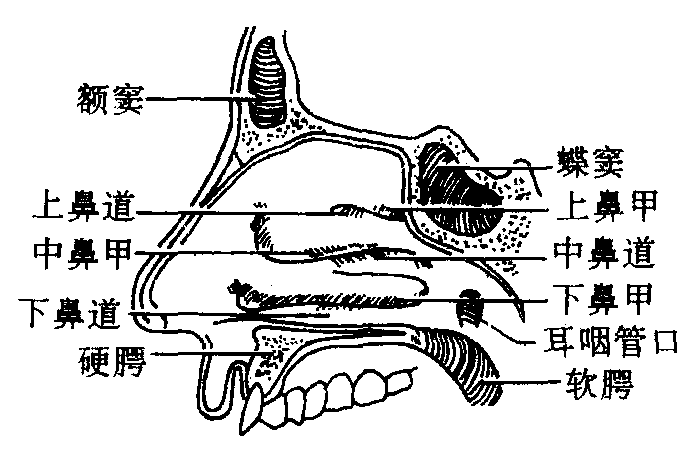 | 释义 | 鼻的结构和机能鼻可分为外鼻、鼻腔和鼻窦三部分。外鼻为鼻的外表部分。上部的支架是硬骨,下部的支架为软骨,鼻尖两侧膨出部称鼻翼,鼻翼下为鼻孔。鼻腔是鼻呼吸的通道,被鼻中隔分为左右两侧,以粘膜覆盖,鼻翼内侧的粘膜上有鼻毛。鼻腔后与咽部相通。鼻中隔前下部粘膜血管特别丰富呈网状,容易出血。鼻腔的外侧壁各有上、中、下三块卷状的鼻甲突入鼻腔(见图1.6-3)。每块鼻甲下方的鼻道分别称为上、中、下鼻道。下鼻道的前端有鼻泪管的开口。鼻是呼吸道的门户,有使吸入空气加温(因丰富的血液供应可使寒冷空气接近体温)、湿润(因粘膜水分蒸发和粘液分泌可增加吸入气湿度)、清洁(鼻毛和鼻粘液阻挡和吸附灰尘和细菌)和保护(通过打喷嚏和大量粘液分泌,排除异物和有害气体)作用。上鼻甲和鼻中隔上1/3的粘膜为嗅上皮(其中有嗅细胞),与有气味的气体接触时,可使它们兴奋并沿嗅神经传导到大脑引起嗅觉。平静呼吸时,气浪不能直接达到嗅粘膜。当有意识地嗅气味时,用力吸气,气浪可直接到达嗅粘膜,使嗅觉敏感性大大提高。鼻窦是鼻腔周围含气体的骨质空隙,通过小管或开口和鼻腔相通,分为额窦、筛窦、上颌窦和蝶窦,它们与鼻腔在一起,在发音中起共鸣作用,使声音清晰悦耳。鼻窦粘膜与鼻腔粘膜相连,窦内分泌物可排到鼻腔。鼻窦发生炎症出现脓性分泌物时,在鼻腔的开口部位会出现脓液。