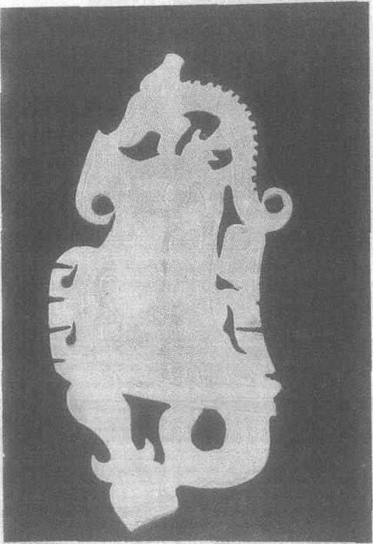 | 释义 | 龙啮鸟纹玉佩商。高11.3厘米,横5厘米。台北故宫博物院藏。玉料为淡桔黄色,体扁平。所琢为鸟的侧面,钩喙、短翼、长尾,背腹边缘有镂空边饰。鸟的眼和身体等部位均以凸线装饰。鸟的头部伏一龙,尾部向上内卷,龙身上的纹饰装饰手法与鸟身相同。龙口大张,似欲啮鸟。商代的玉器上常有龙的形象,可能是龙具有图腾意义的缘故。此件玉佩雕琢精致,是典型的商晚期造型。
