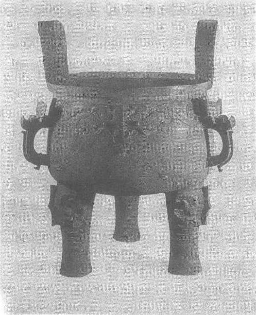 | 释义 | 龙纹五耳铜鼎西周。通高122厘米,口径83厘米,腹深54厘米。重226公斤。1979年陕西省淳化史家塬出土。陕西省淳化县文化馆藏。鼎,古代炊具。商、周时多为青铜礼器。此鼎平沿折唇,上有双立耳,耳的外侧饰两条相向的龙纹,均以细雷纹填地。口沿下饰夔龙六条,两两相对。中间隔有短扉棱。夔龙卷尾,圆目凸起,张口卷唇,合观之,则为饕餮纹。饕餮之下有浮雕小牛首,造型奇特,栩栩如生。腹部还铸有三个兽首屈耳鋬,上有扉棱,各与一足相对,不但实用且富于装饰性。鋬上兽耳高耸,饰卷曲的夔龙。鋬下有钩珥。鼎足上饰浮雕饕餮面,四角突出器外,巨目利爪,咧嘴欲噬。主体花纹之外均用云雷纹填地。内底有三个直径为18.2厘米,深17厘米的圆窝,与鼎足相对。此鼎是我国目前已知的西周铜鼎中最大和最重的一件。其造型魁伟,形制、纹饰庄重神奇,是青铜器艺术宝库中的一件瑰宝。