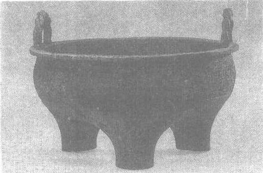 元。通高19.5厘米,口径26.5厘米。1981年北京市延庆县出土。北京市文物工作队藏。此炉扁圆体,平沿、束颈,腹微鼓,三粗短袋形足,口沿两侧立绳形双耳。腹部上下饰两道弦纹,弦纹间饰三组龙纹,每组以竖道弦纹为界。
