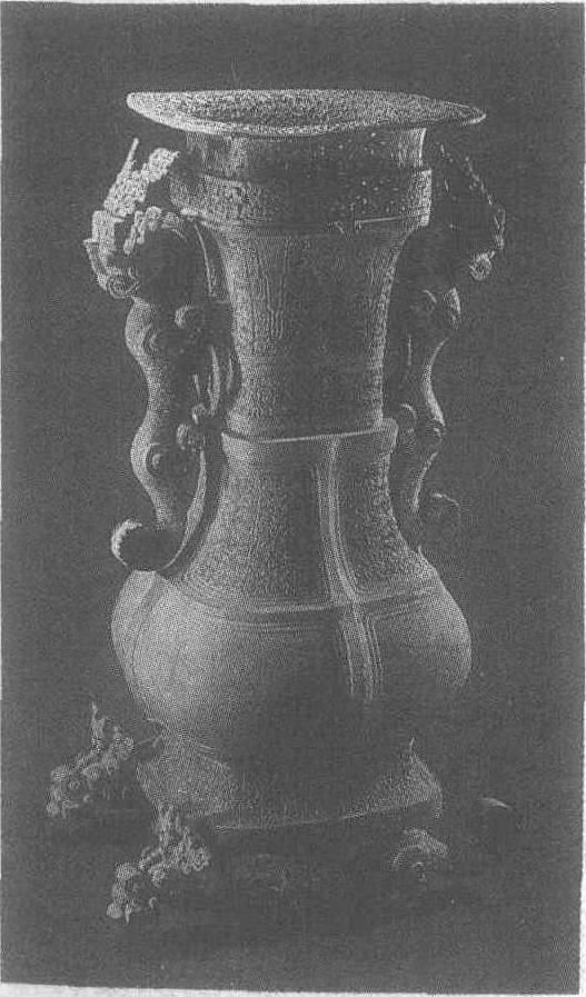春秋。盛酒器。通高79厘米,口长22.7厘米,口宽18.8厘米。1978年河南省淅川县下寺1号楚墓出土。河南省博物馆藏。此壶方口,圆腹,盖铸成镂孔夔龙纹。颈部焊接龙形双耳。底有两兽俯伏作足,承托全器。器身饰蟠虺纹与云雷纹。此器魁伟,造型奇特,堪称春秋青铜器之佳作。