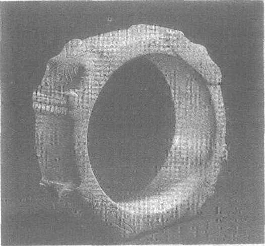 | 释义 | 龙首浮雕玉镯形器铜石并用时代良渚文化。外径8.2厘米,宽2.6厘米。1987年浙江省余杭瑶山良渚墓葬第1号墓出土。白玉制品。形为宽扁的环状,内壁光滑,外壁等距离浮雕四个龙首图形。龙双眼圆突,方鼻,鼻孔琢于两侧,嘴宽平,露齿,额上方有一对短角。环体侧面有阴线刻龙侧视外形。器身如环曲的龙身。以前称这种玉器为“黄龙环”。它与商、西周、春秋、战国时期的龙形玉雕有相似之处,曾误将它作为汉代文物。瑶山良渚墓葬中的发掘证明,它是5000年前的文化遗物。良渚文化见“方柱形玉尖状器”条目。