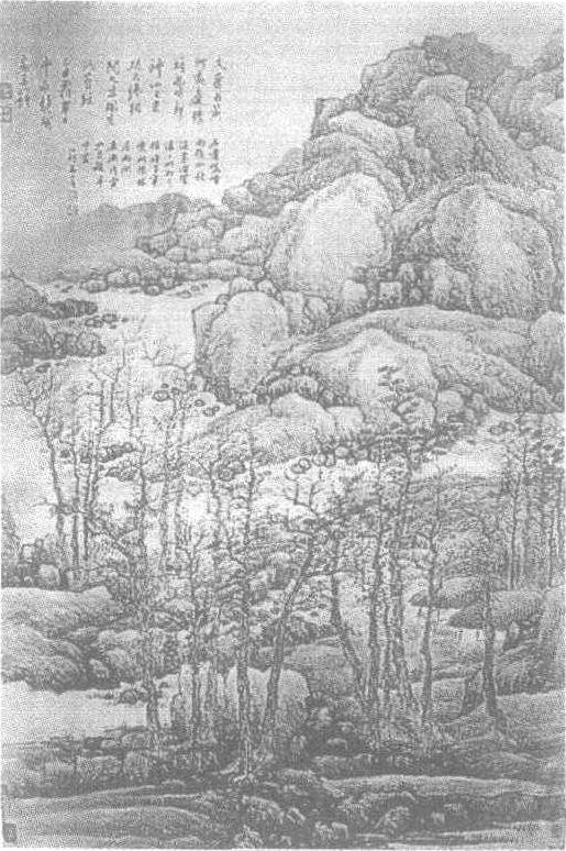 龚贤 《木叶丹黄图》 龚贤(1618——1689),又名岂贤,字半千,又字野遗,号半亩,又号柴丈。江苏昆山人,后定居南京。是清代 “金陵八家” 中最有成就的画家。他的山水画师法董源、巨然,具有浑厚、苍润的特点。此图是他用墨较简洁的一张作品,达到了清新、古朴的艺术境界。 |